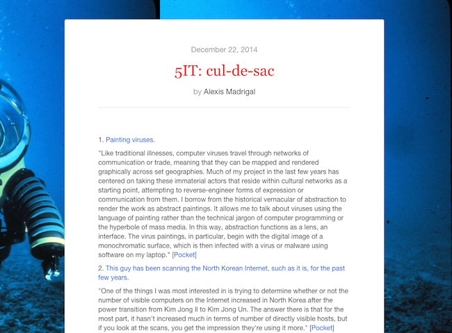 Alexis Madrigal puts together a daily newsletter featuring interesting articles from around the web. I’m always surprised by the variety of articles – one issue featured an article on painting human viruses, the use of Internet in North Korea, self-driving cars, virtual reality startups, and the finding of a 10 million-year-old megalodon tooth on the coast of California. This newsletter's contents will expand your mind.