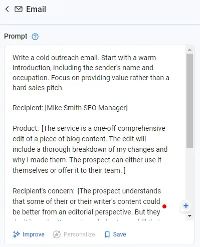 I also wouldn’t recommend using AI to generate cold emails if you’re contacting a specific person for the first time. And I really wouldn’t recommend it if you’re sending a cold outreach email to a potentially high-value prospect. Intensive research, personalization, and heavy lifting are justified in this case.